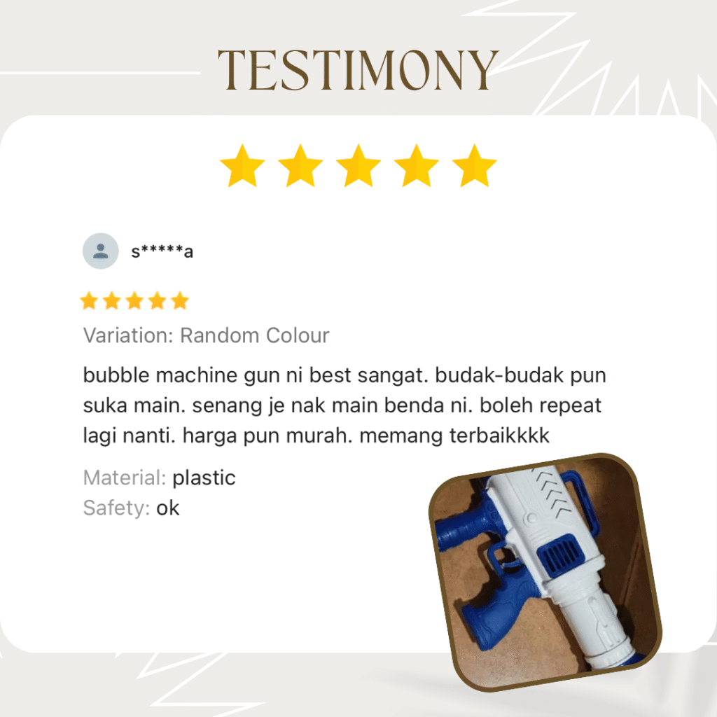 | Susah nak cari aktiviti bonding dengan anak π¨βπ©βπ§βπ¦ | Bubble Gun sesuai untuk aktiviti parent-child interaction π€ |