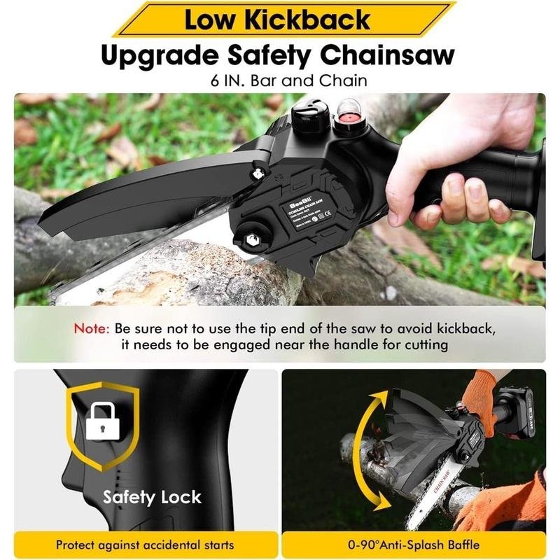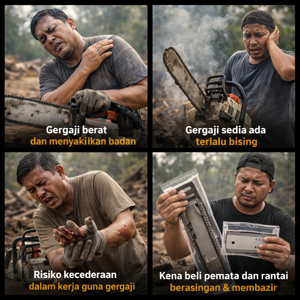 ❌ Chainsaw besar – terlalu berat & tidak sesuai untuk warga tua sebab risiko cedera✅ Sangat ringan, mudah digunakan & ada penyekat unuk keselamatan