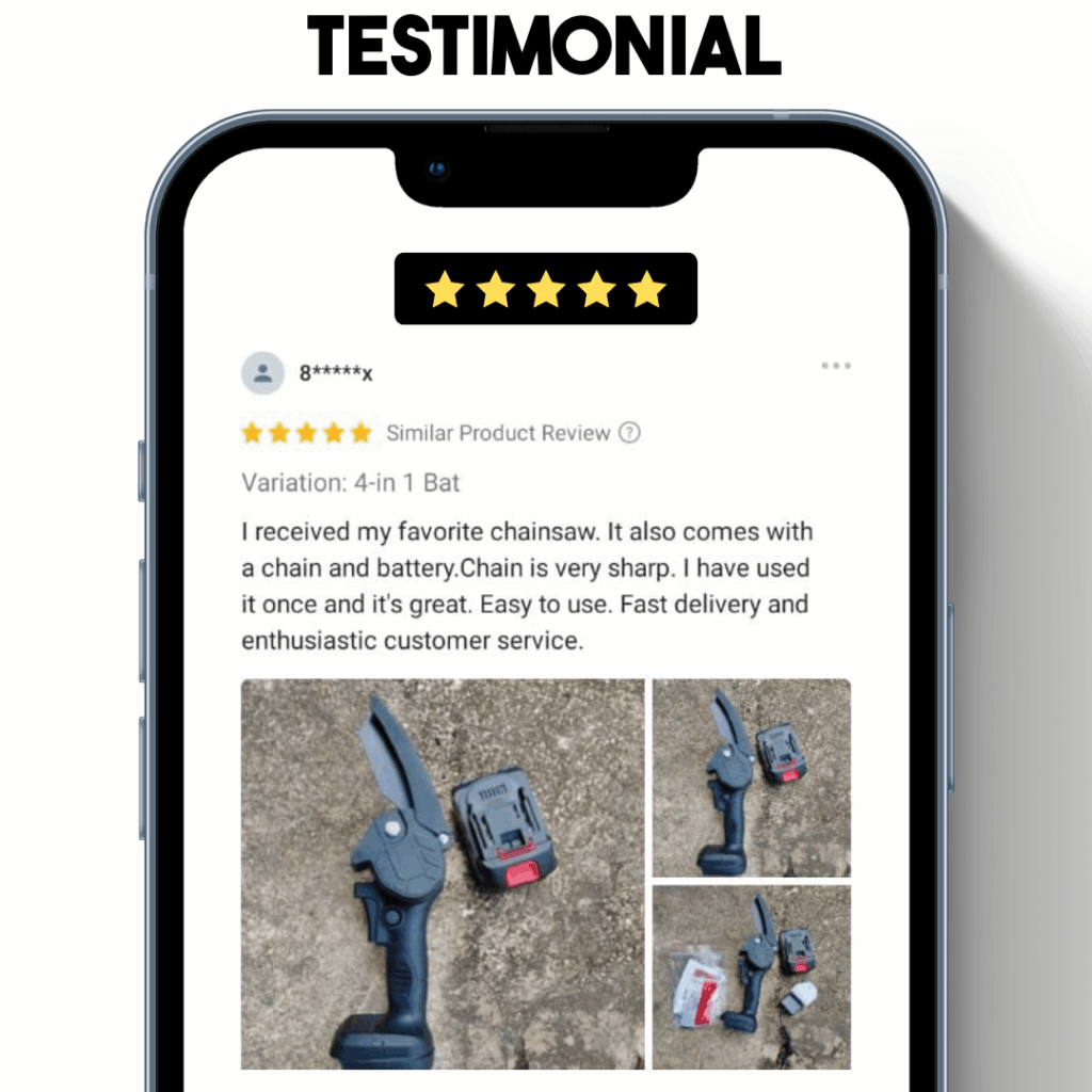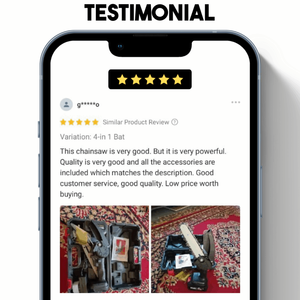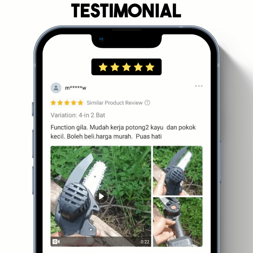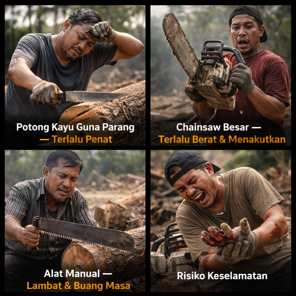 ❌ Chainsaw besar susah dibawa ke mana-mana, dan kerja kadang guna 2 orang untuk pokok besar✅ Portable & praktikal – sesuai dibawa ke mana saja