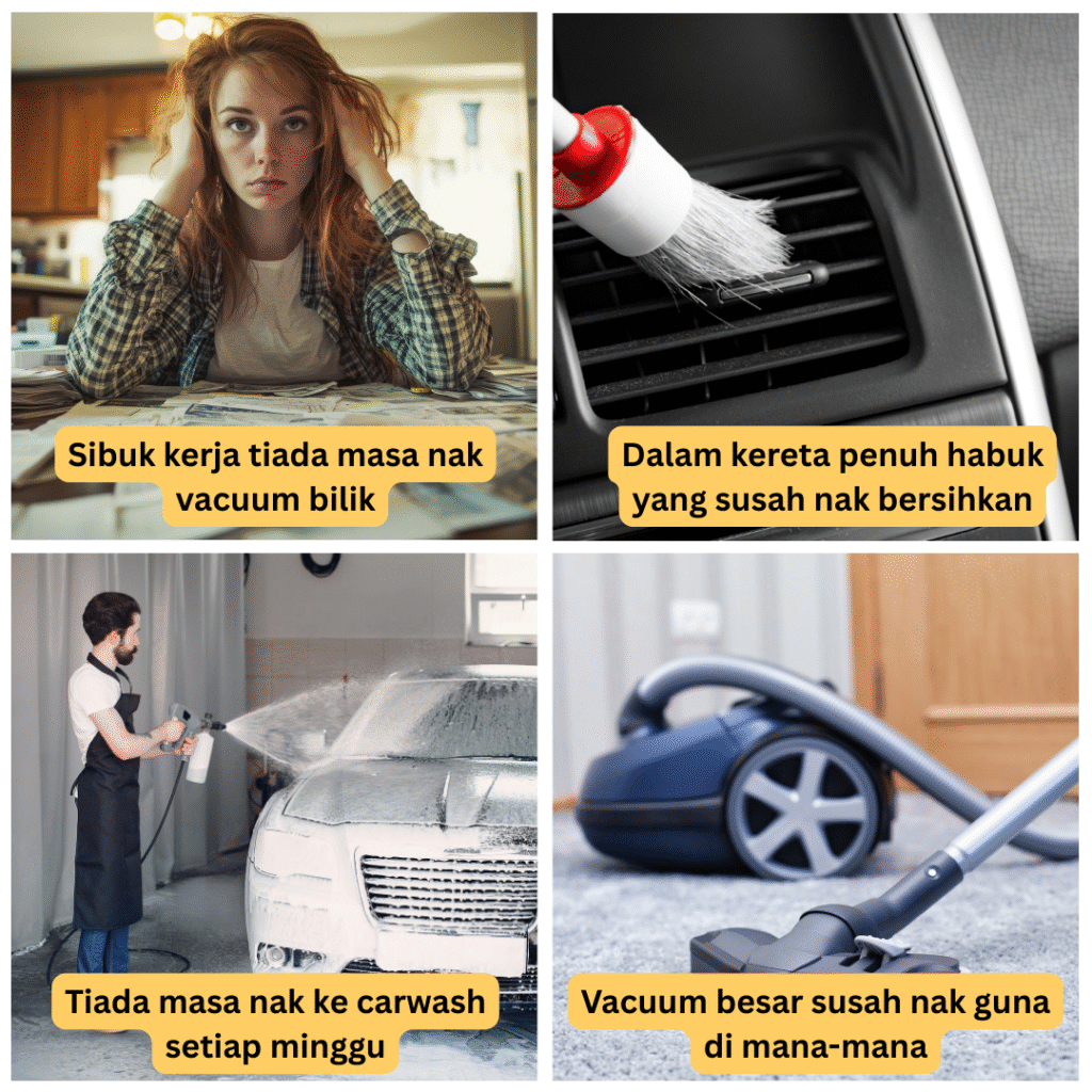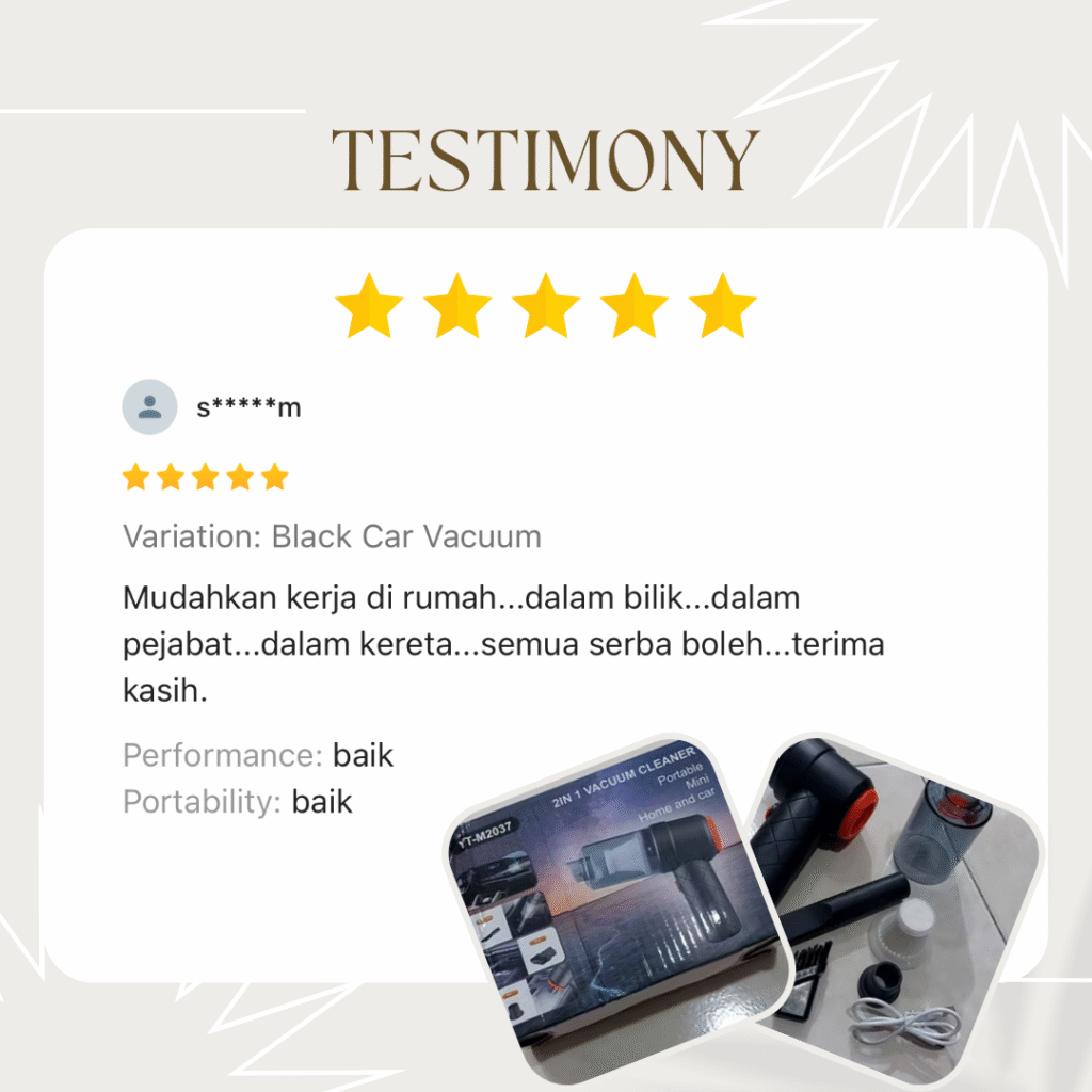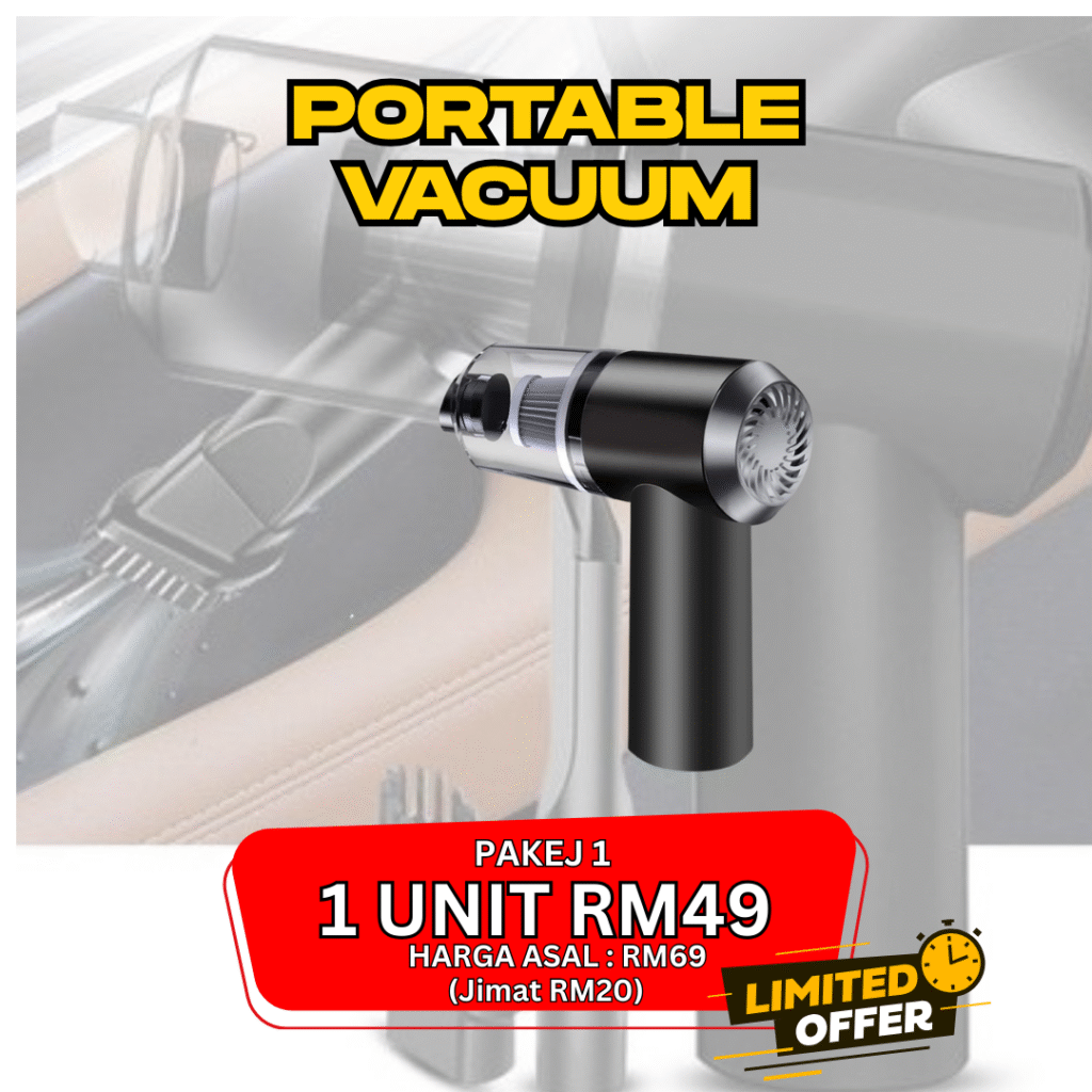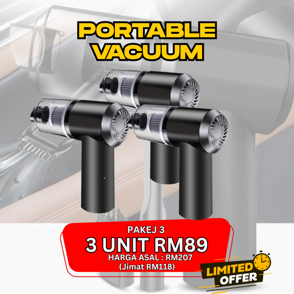 Pernah tak rasa geramβ¦ kereta baru je cuci, tapi esok dah penuh habuk, pasir & sisa makanan anak? π€¦ββοΈπ Masalah Yang Ramai Hadapi Tanpa Sedar Sibuk kerja tiada masa nak vacuum bilik Dalam kereta penuh habuk yang susah nak bersihkan Tiada masa nak ke carwash setiap minggu Vacuum besar susah nak guna di mana-mana Serabut tengok habuk, pasir & sisa makanan bersepah Jangan Risau! Inilah Solusi Yang Paling Berkesan! Telah Terjual Sepanjang Tahun 0 MEMPERKENALKAN "Portable Vacuum" Kecil Tapi KUAT! Wajib Ada Dalam Kereta Anda πβ¨ Kecil & kompak - Mudah simpan dalam cup holder, pintu kereta, dashboard atau beg. Tidak makan ruang langsung. Sedutan Kuat Dengan Teknologi Cyclone - Walaupun kecil, power dia memang padu! Habuk halus, pasir, rambut & sisa makanan hilang dalam beberapa saat. Wireless & Rechargeable USB π - Tak perlu wayar panjang β hanya charge guna USB (powerbank pun boleh). Filter Boleh Basuh - Tak perlu beli filter baru β tarik keluar & cuci sahaja. Spesifikasi Produk Kelebihan Portable Vacuum Ni β Simple Tapi Besar Manfaatnya: Vacuum Kereta LainPortable Vacuum Cleaner (Model Ini)β Besar & makan ruangβ Mini & sangat kompakβ Kena sambung ke lighter keretaβ Wireless & rechargeable USBβ Tiada lampu LEDβ Ada LED untuk kawasan gelapβ Filter sukar dicuciβ Filter boleh basuh & reusableβ Sedutan kurang kuatβ Sedutan kuat teknologi Cyclone Apa Kata Pengguna Sebenar? Berita Baik Untuk Yang Grab Hari Ini! Promosi Khas Hari Ini PROMO TAMAT DALAM MASA Jangan Tunggu Lagi LIMITED PROMO HARI INI!!Bertindak Sekarang! βStok Terhad Order Sekarang!!β Nak Order? Sila Isi Borang Tempahan di Bawah