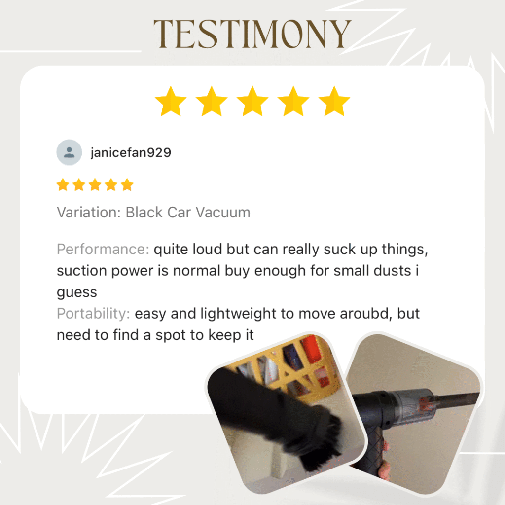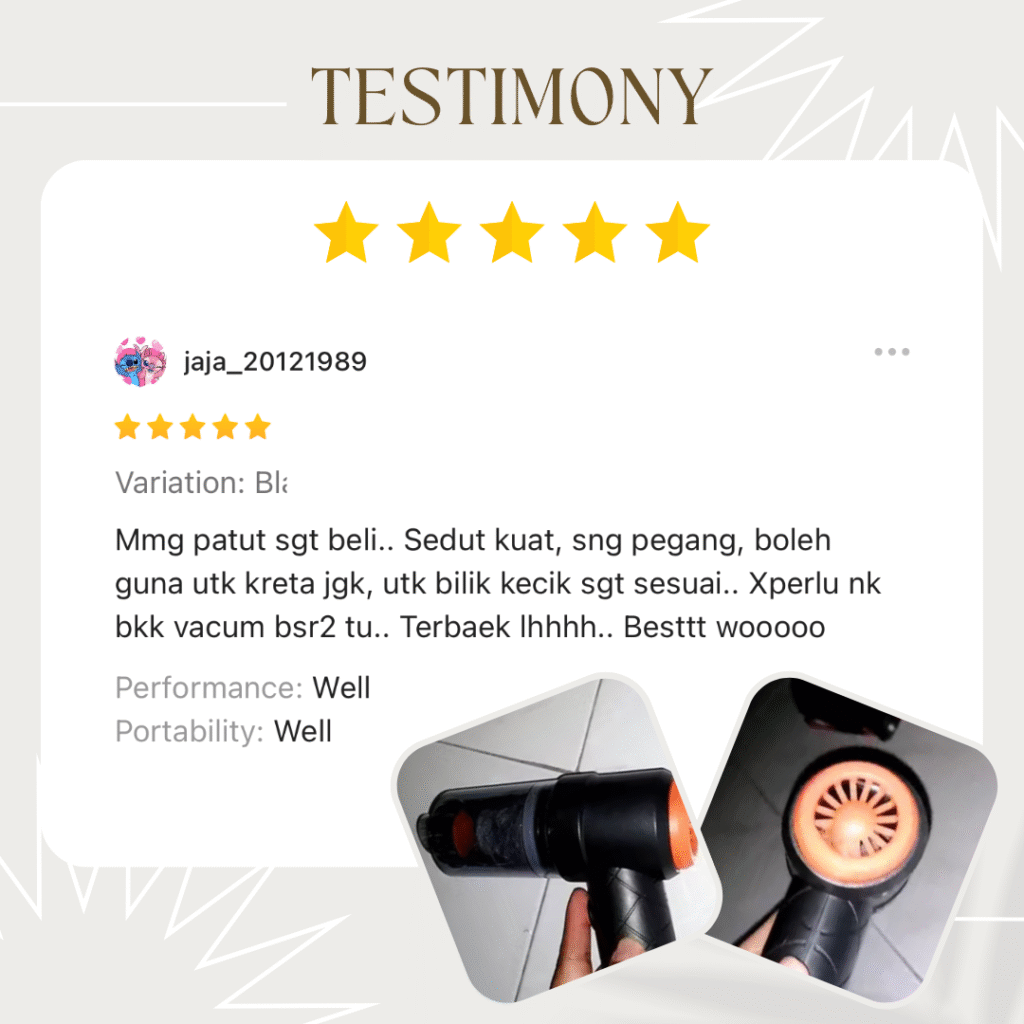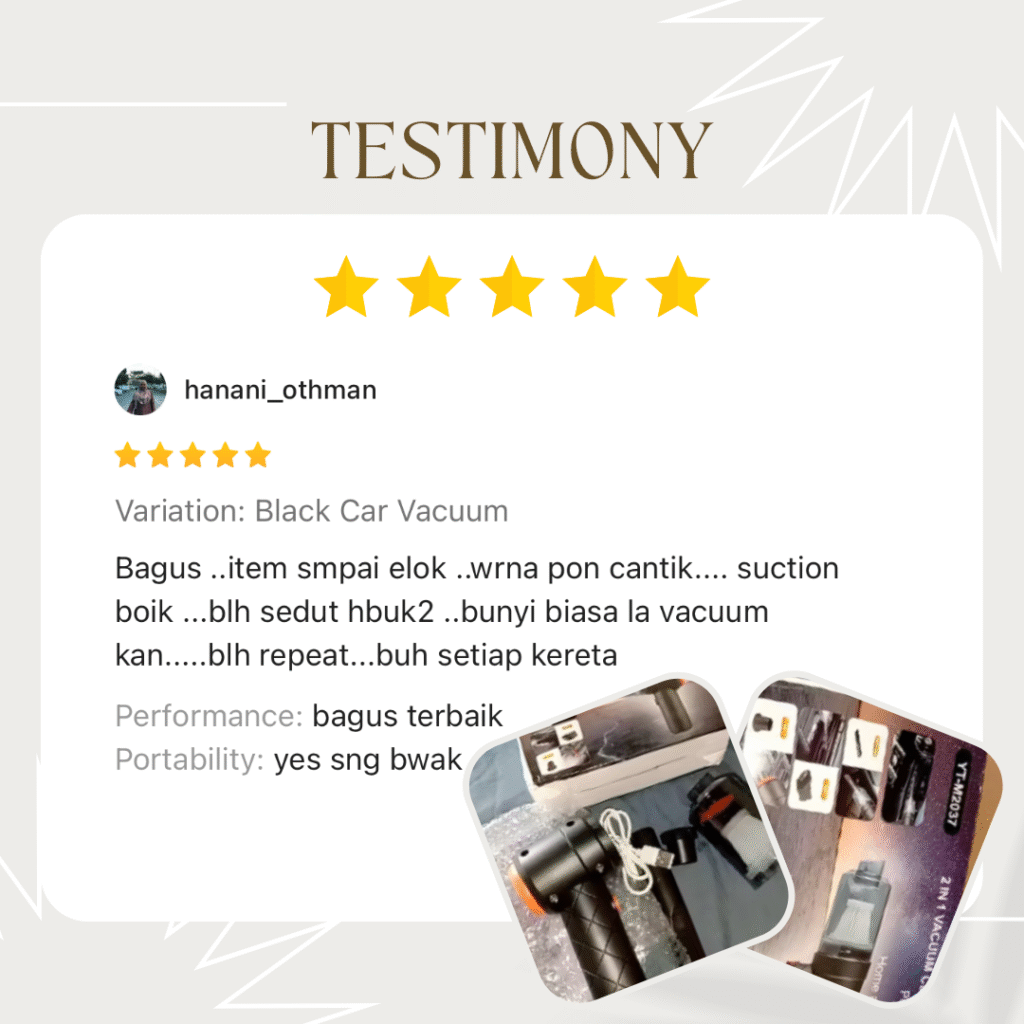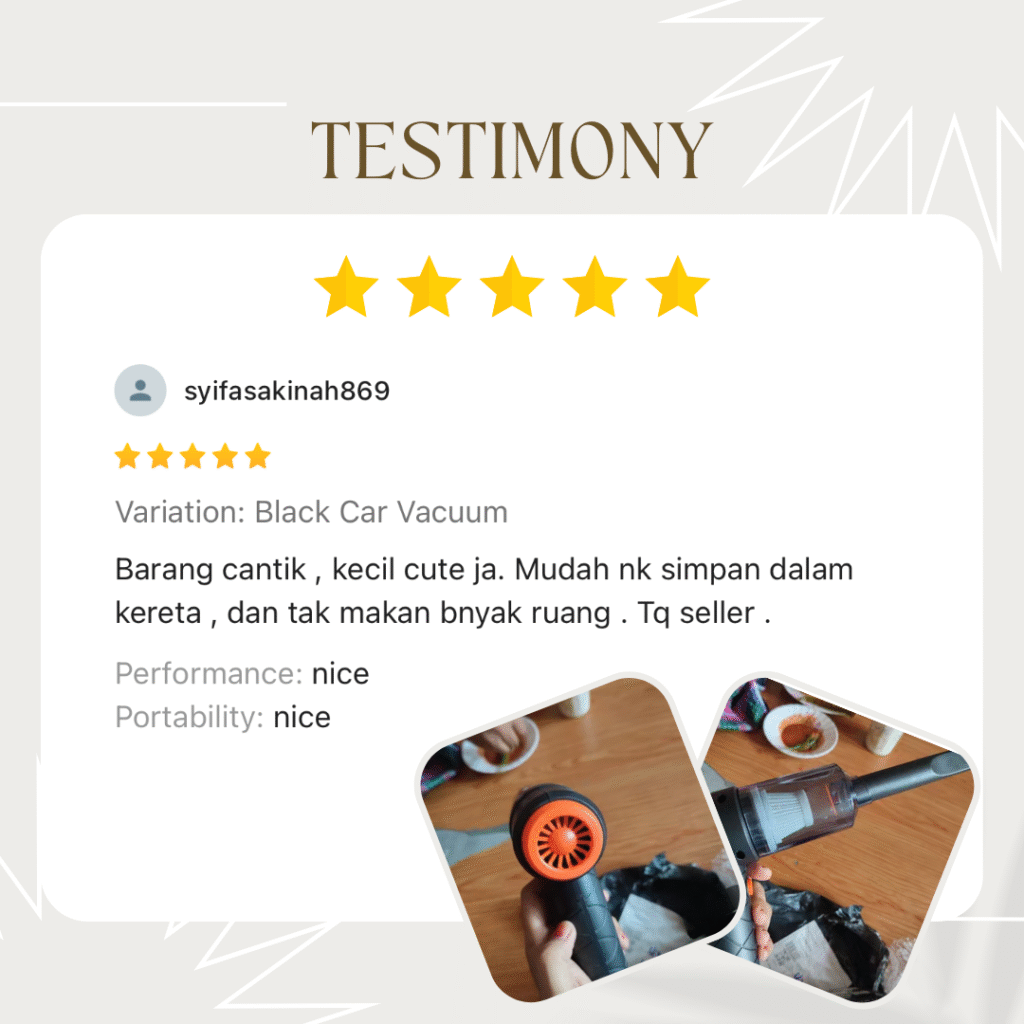 Pernah tak rasa geramβ¦ kereta baru je cuci, tapi esok dah penuh habuk, pasir & sisa makanan anak? π€¦ββοΈπ Masalah Yang Ramai Hadapi Tanpa Sedar Sibuk kerja tiada masa nak vacuum bilik Dalam kereta penuh habuk yang susah nak bersihkan Tiada masa nak ke carwash setiap minggu Vacuum besar susah nak guna di mana-mana Serabut tengok habuk, pasir & sisa makanan bersepah Jangan Risau! Inilah Solusi Yang Paling Berkesan! Telah Terjual Sepanjang Tahun 0 MEMPERKENALKAN "Portable Vacuum" Kecil Tapi KUAT! Wajib Ada Dalam Kereta Anda πβ¨ Kecil & kompak - Mudah simpan dalam cup holder, pintu kereta, dashboard atau beg. Tidak makan ruang langsung. Sedutan Kuat Dengan Teknologi Cyclone - Walaupun kecil, power dia memang padu! Habuk halus, pasir, rambut & sisa makanan hilang dalam beberapa saat. Wireless & Rechargeable USB π - Tak perlu wayar panjang β hanya charge guna USB (powerbank pun boleh). Filter Boleh Basuh - Tak perlu beli filter baru β tarik keluar & cuci sahaja. Spesifikasi Produk Kelebihan Portable Vacuum Ni β Simple Tapi Besar Manfaatnya: Vacuum Kereta LainPortable Vacuum Cleaner (Model Ini)β Besar & makan ruangβ Mini & sangat kompakβ Kena sambung ke lighter keretaβ Wireless & rechargeable USBβ Tiada lampu LEDβ Ada LED untuk kawasan gelapβ Filter sukar dicuciβ Filter boleh basuh & reusableβ Sedutan kurang kuatβ Sedutan kuat teknologi Cyclone Apa Kata Pengguna Sebenar? Berita Baik Untuk Yang Grab Hari Ini! Promosi Khas Hari Ini PROMO TAMAT DALAM MASA Jangan Tunggu Lagi LIMITED PROMO HARI INI!!Bertindak Sekarang! βStok Terhad Order Sekarang!!β Nak Order? Sila Isi Borang Tempahan di Bawah