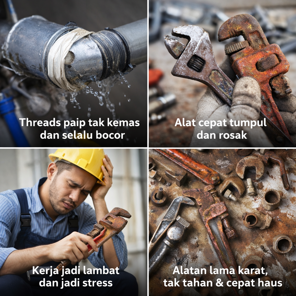 Hasil thread lebih kasar dan paip cepat bocor | Hasil thread lebih kemas dan ketat serta kurang risiko bocor paip |
