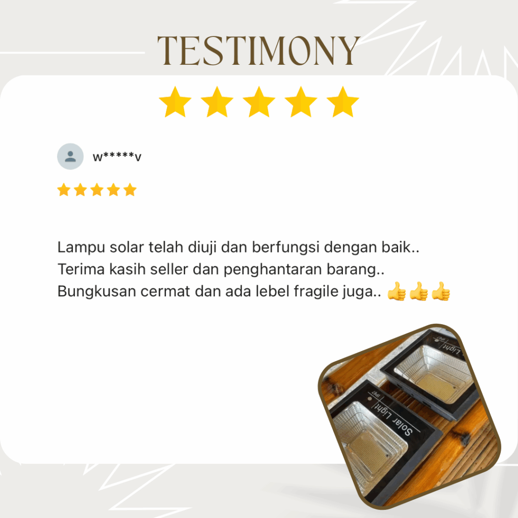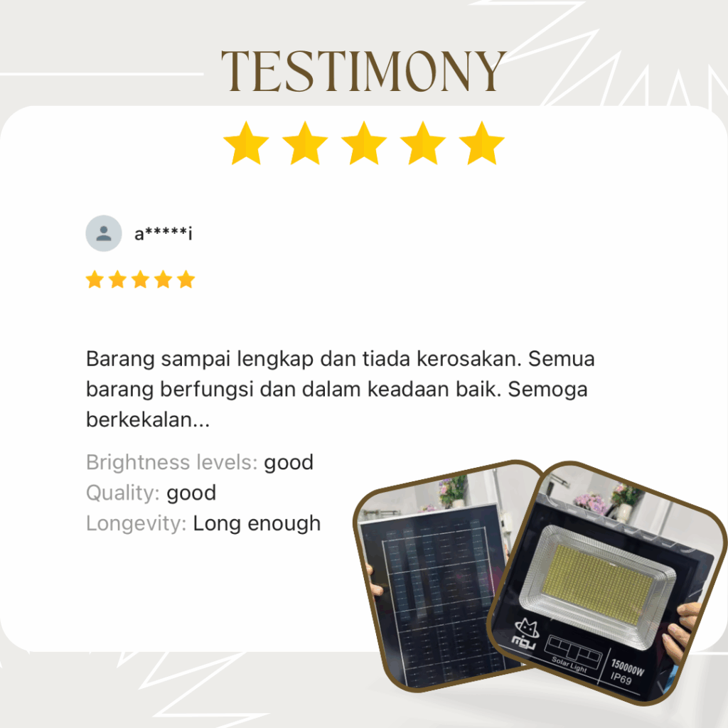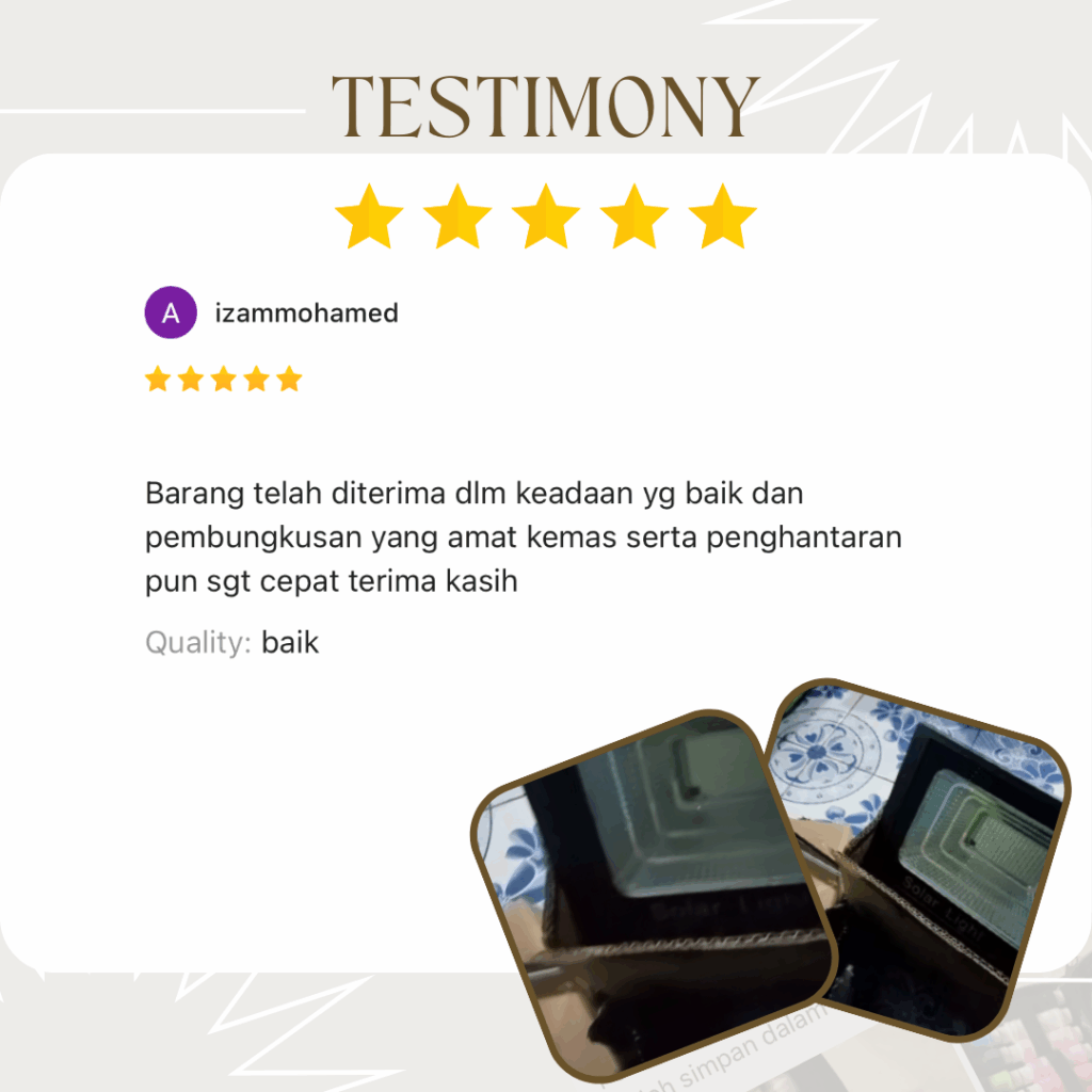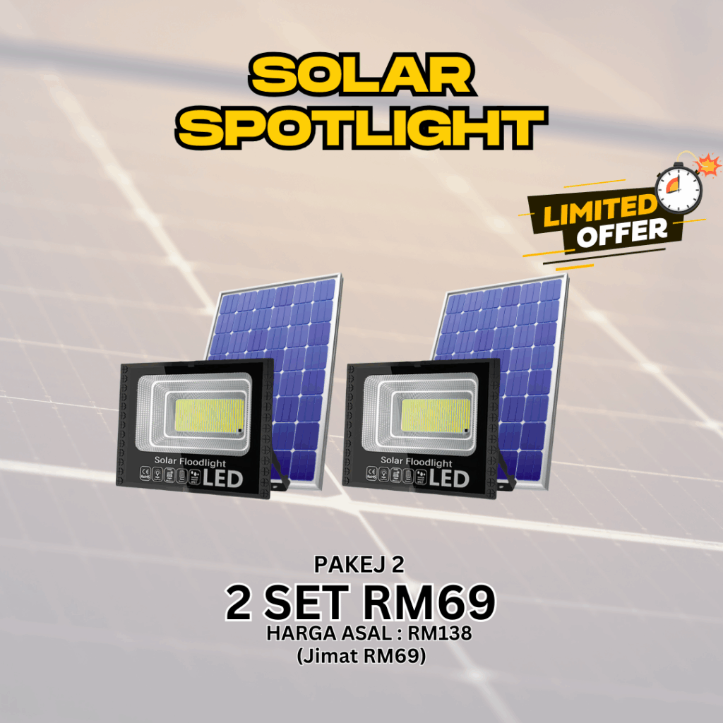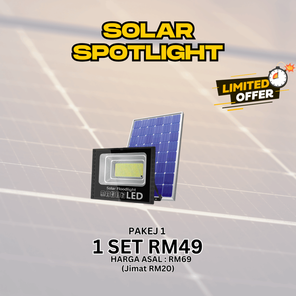 Rumah gelap waktu malam bukan sekadar tak cantikβ¦ tapi bahaya. β οΈ Masalah Yang Ramai Tak Sedar Suasana car porch rumah sangat gelap bila tak buka lampu luar Bahaya sekiranya ada perompak di luar rumah Bila pasang spotlight bill melambung tinggi Kadang keselamatan rumah bermula dari pencahayaan luar. Jangan Risau! Inilah Solusi Yang Paling Berkesan! Telah Terjual Sepanjang Tahun 0 MEMPERKENALKAN "SOLAR SPOTLIGHT π‘" Lampu terang β bukan macam lampu biasa. π 1088 High Brightness LED π§ Waterproof Outdoor Design - Hujan panas ribut pun tahan. π Zero Electricity Bill π― Lighting Coverage Luas Rumah nampak premium & selamat Elak kawasan gelap jadi sasaran pencuri Spesifikasi Produk Kelebihan Solar Spotlight Ni β Simple Tapi Besar Manfaatnya: Perkaraπ‘ Lampu BiasaβοΈ Solar SpotlightBil elektrikβ Tambah setiap bulanβ RM0 elektrikWiringβ Perlu tarik kabelβ Tak perlu wiringPemasanganβ Perlu technicianβ DIY pasang sendiriAuto on/offβ Manualβ Auto siang/malamTahan hujanβ Cepat rosakβ Waterproof outdoorCoverage cahayaβ Terhadβ Lebih luas & terangMaintenanceβ Selalu rosakβ Low maintenance Apa Kata Pengguna Sebenar? Berita Baik Untuk Yang Grab Hari Ini! Promosi Khas Hari Ini PROMO TAMAT DALAM MASA Jangan Tunggu Lagi LIMITED PROMO HARI INI!!Bertindak Sekarang! βSTOK ADALAH LIMITEDβ Nak Order? Sila Isi Borang Tempahan di Bawah Solar Spotlight MYPakej Pakej 1 - RM49 (1x Set Solar Spotlight) Pakej 2 - RM69 (2x Set Solar Spotlight) Pakej 3 - RM89 (3x Set Solar Spotlight)NAMA PENUHALAMATPOSKODNO TELEFONNOTAPOSTAGE COD (RM10)Tempah Sekarang